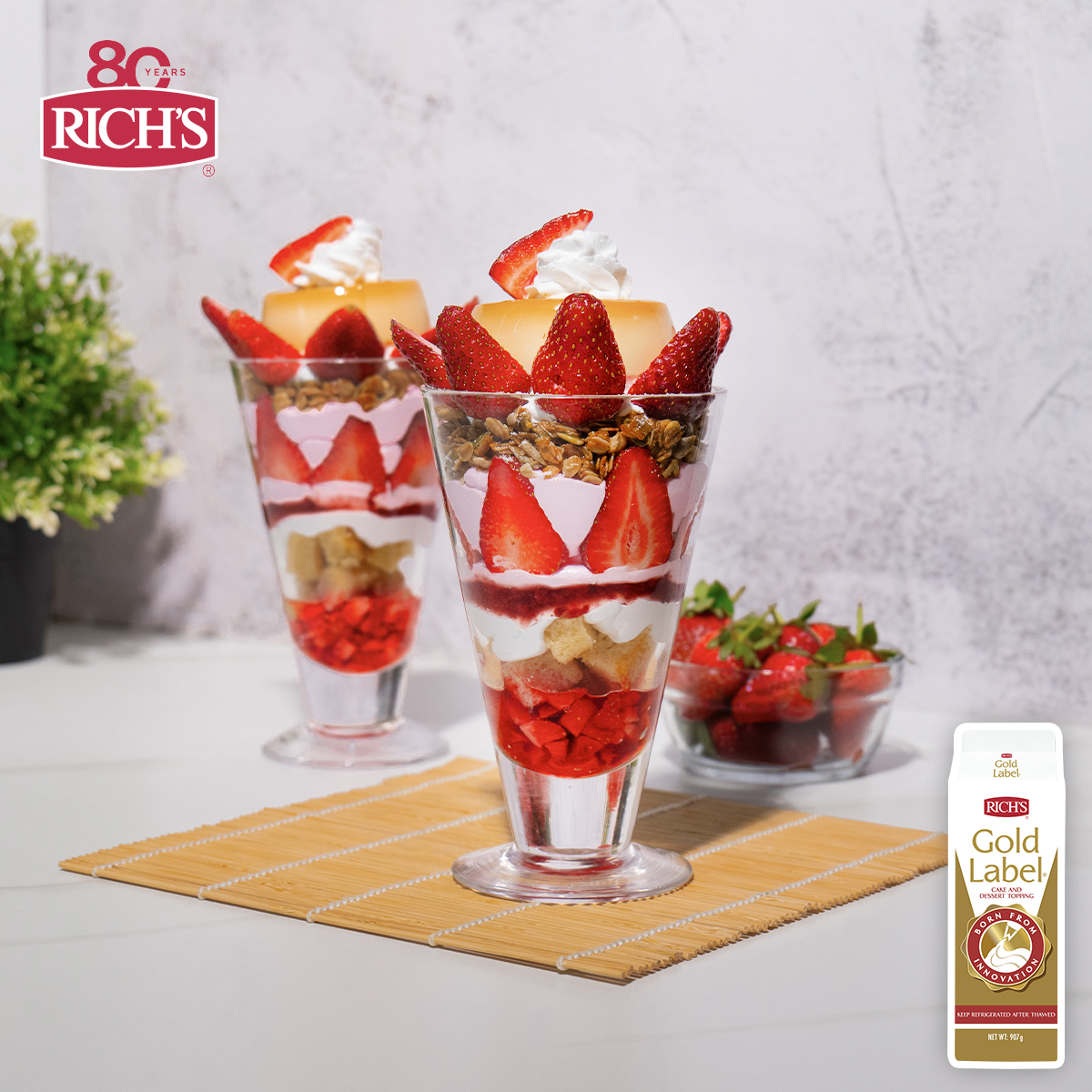 Try this Japanese Purin Strawberry Parfait for the ultimate sweet tooth fix. Packed with sweet strawberries and creamy caramel pudding, it’s perfectly layered with the smooth strawberry and vanilla cream made from Rich’s Gold Label. One scoop is all it takes to enjoy a bite full of flavor and satisfaction.