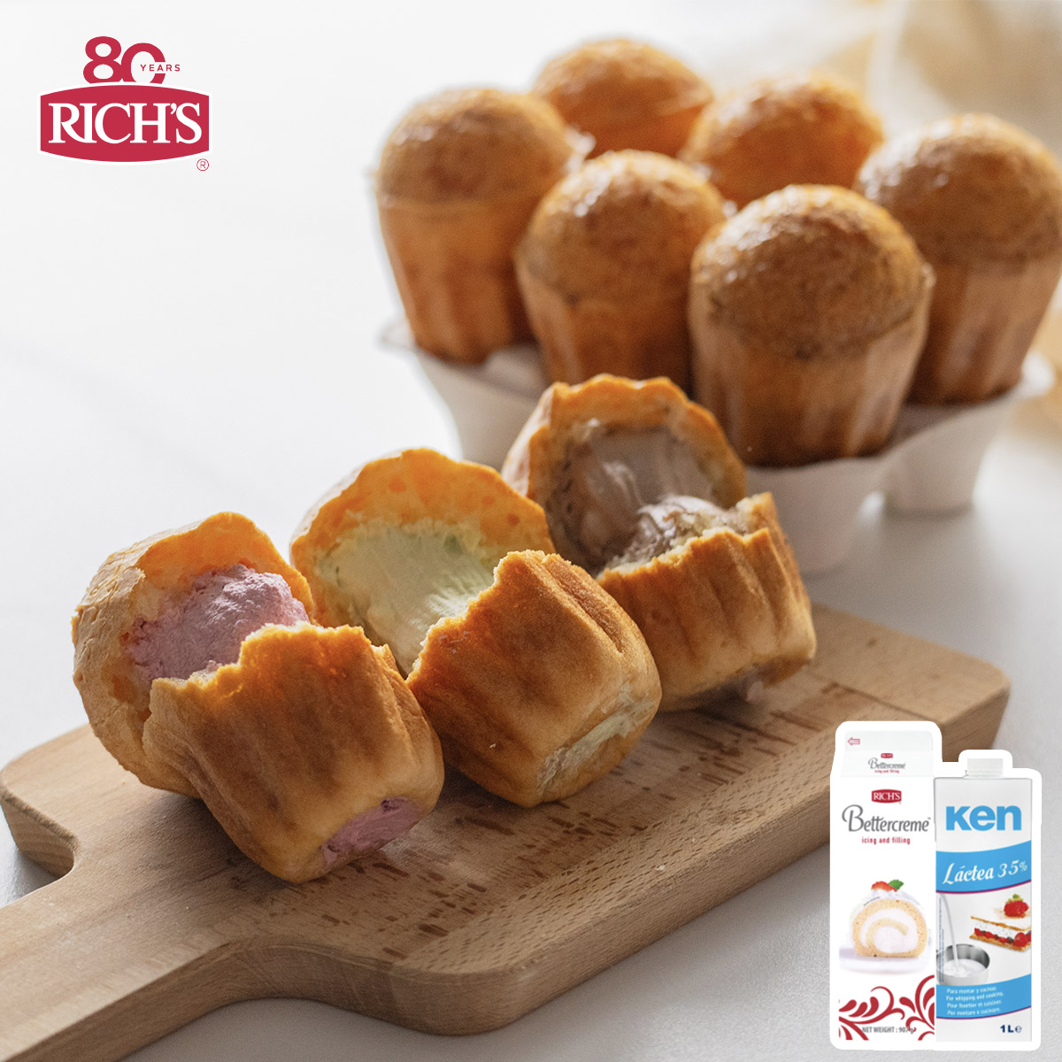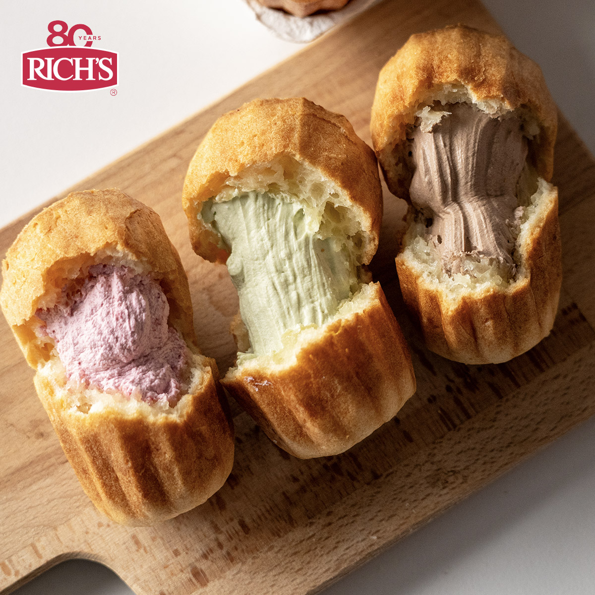 Soft and chewy Korean Cheese Bread made with tapioca starch and cheddar cheese, filled with chocolate, green tea, or beetroot cream using Ken Lactea 35% and Rich’s Bettercreme for smooth, stable results.